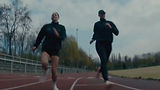 We cut back in time to the blueish dawn where it all began. One runner double knots their ASICS sneaker. The other lightly swings their arms. They stand side-by-side, braving the cold, determined.